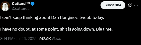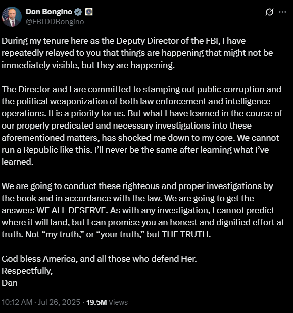 I took a closer look at Bongino’s tweet after I saw this from one of the most prominent sites on X; not a pleasant name (especially for those of us with large cats in the house!) and foul language but I do recommend that those who are on X go to the comments under his tweet as they reflect what I feel many of us are sensing- that there are major revelations, in addition to the stunning disclosures by DNI Tulsi Gabbard last week, about to be made public.