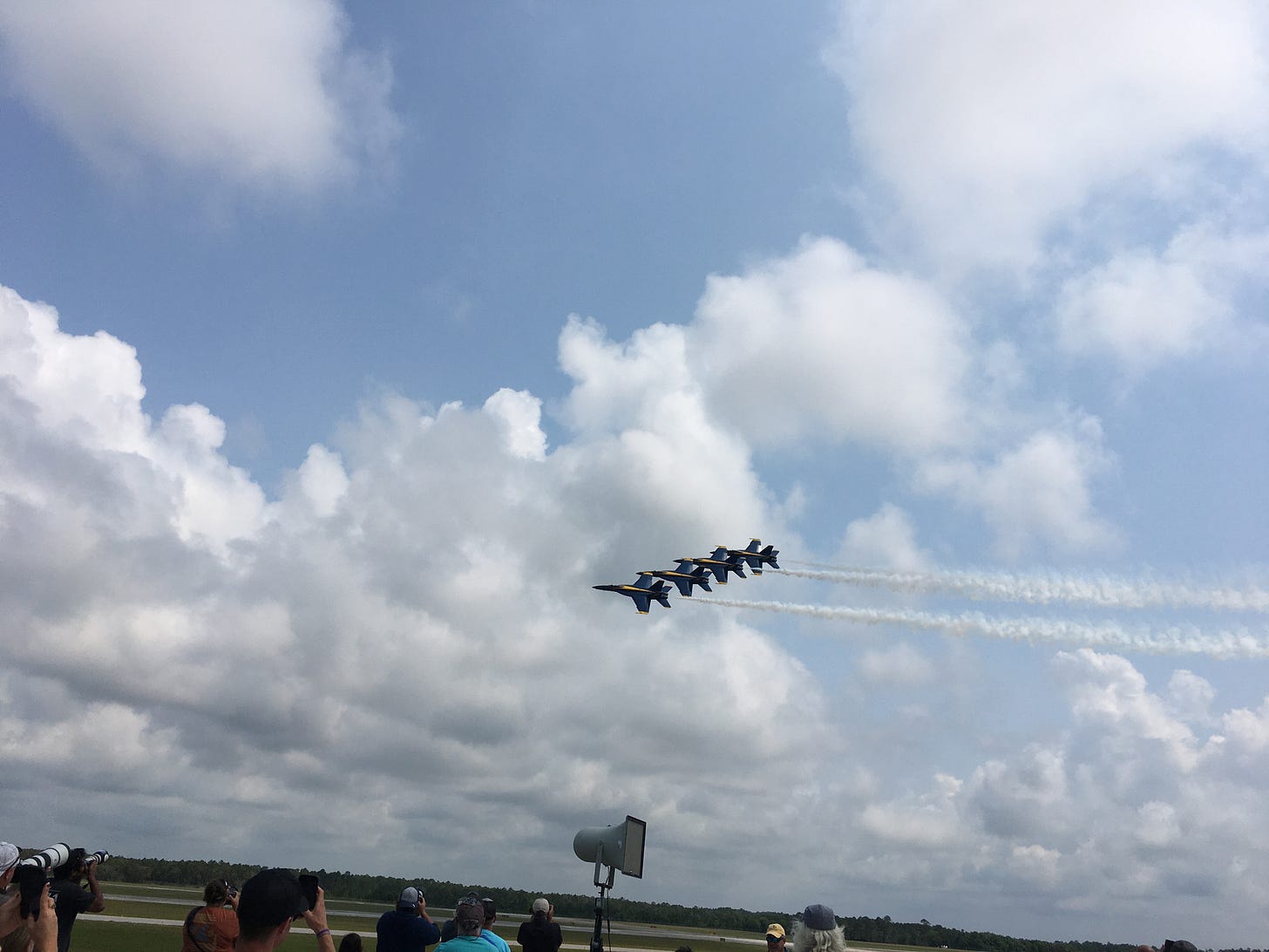 People have as many “addictions” as there are people, I suppose. I hesitate to even use that word in view of the horrendous nightmares it has visited upon so many families, including, most definitely, ours. However, I guess if one is to have one of those, it might not be the worst outcome to be totally “addicted” to the finest aerobatics demonstration team ever assembled, The Blue Angels, who are based at Pensacola Naval Air Station, a short drive from our new home here in the Florida Panhandle. As a result, I try to get out to the base every Tuesday or Wednesday for their practice sessions and I also try to be on the beach when they return home from one of their shows around the country to announce their return home on Sunday evenings with the tradition, well known in these parts, we call “The Beach Buzz!” Here’s a shot from their practice of this morning at the base which I offer as Exhibit A in support of the proposition that I am well and truly “hooked” on the Blues!