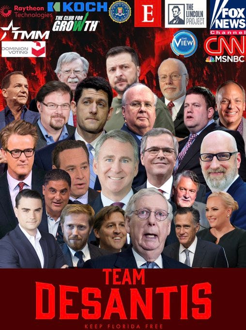 We are beginning to hear more and more reports that “Big Con” is gathering strength in support of our superb Governor and that he will become, in effect, the elite “RINO” candidate for the nomination. Here is a representative article, entitled “Establishment DeSantis Management and Branding Team Schedule Nationwide Book Tour in Advance of 2024 Announcement” and below is the graphic accompanying that article, containing enough reprehensible RINOs to send you straight to the sickroom