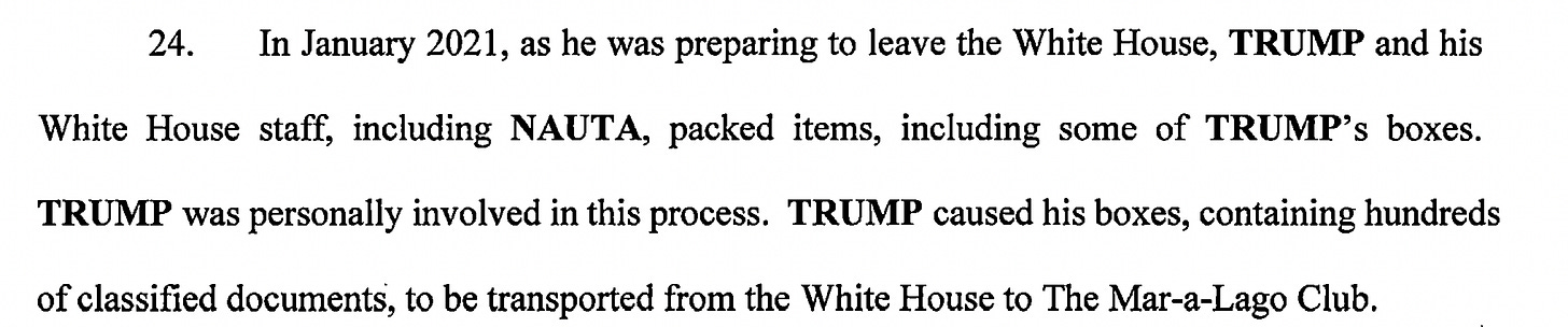 The outstanding question is whether Trump was unauthorized to possess the national defense documents at issue. If Trump rightfully possessed those documents, if they were his documents, then the whole indictment falls apart. If Trump was not unauthorized to possess anything, and thus was not concealing or misrepresenting anything when he claimed that he had no other documents that needed to be turned over, there is no longer evidence to prove an essential element of (at least most of) the alleged crimes.